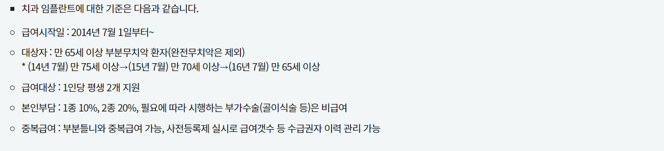 - 치과 임플란트는 1인당 평생 2개 급여 적용