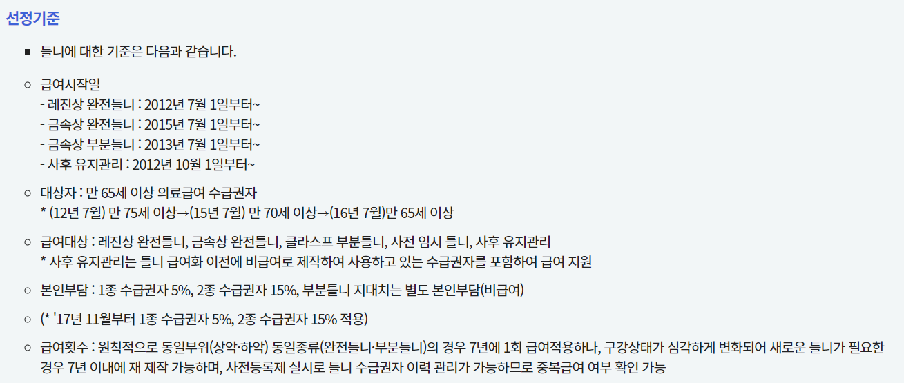 - 틀니는 동일 부위(상악/하악), 동일 종류(완전틀니/부분틀니)의 경우 7년 1회 급여 적용 (단, 구강상태가 심각하게 변화되어 새로운 틀니가 필요한 경우 7년 이내에 재제작 가능)