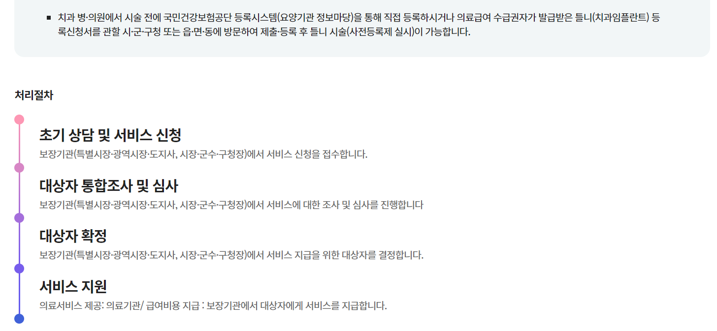 만 65세 이상의 의료급여수급권자이면서 치과 병의원 시술전에 국민건강보험등록시스템(요양기관정보마당)을 통해 직접 등록 또는 의료급여수급권자가 발급받은 틀니(치과임플란트) 등록신청서를 관할 시군구청 또는 읍면동에 방문하여 제출, 등록하신분을 지원합니다 (사전등록제 실시)